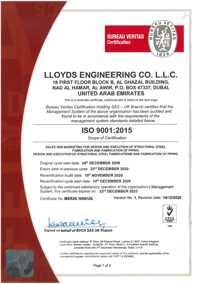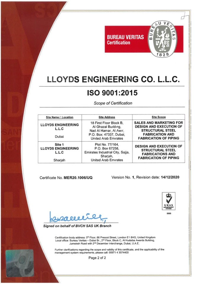 Know More Quality Policy lloyds Engineering co.llc Overview Lloyds Engineering Co. LLC, dedicated to the design and execution of structural steel fabrication, is firmly committed to: Cultivating a positive reputation among our customers through the adoption of systematic practices. Nurturing a collaborative team environment, focused on upholding the highest standards and driving improved business outcomes. Adhering to all relevant statutory and regulatory mandates. Pioneering ongoing enhancements in our Quality Management System through the establishment and regular review of quality objectives. Certificates Sharjah P.O Box- 67258 P.O. BOX. 47337 office@lloydsengg.com